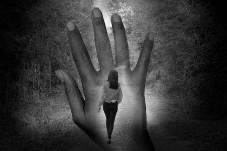 Double exposure black and white image of finger with woman walking on the road in forest. conceptual and broken heart concept.
