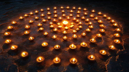 Circular pattern of lit oil lamps or diyas. Diwali festival of lights concept.