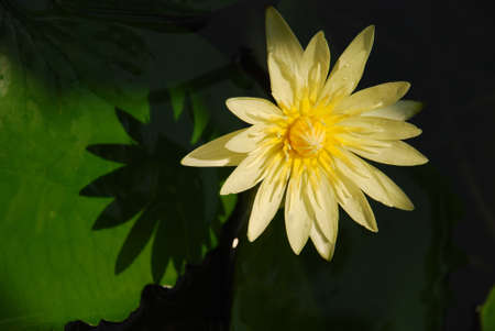 Image of closeup blooming yellow waterlily or lotus flower isolated on black.