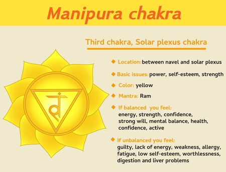 Manipura chakra infographic. Third, solar plexus chakra symbol description and features. Information for kundalini yoga practice