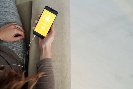 Overview of human hand holding smartphone while going to watch video