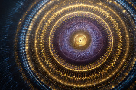 Patterns of light and color swirl in a circular design. Bright points of light connect in spirals. A rich mix of gold and purple fills the scene, creating an energetic display.