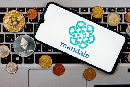Kazan, Russia - Nov 06, 2021: Mandala is a cryptocurrency exchange. A smartphone with the Mandala exchange metal coins, bitcoin, ethereum on a laptop keyboard.