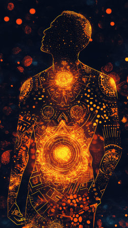 In a dark, cosmic setting, a man stands with an ethereal glow emanating from his body, showing vibrant patterns and energy orbs. The atmosphere is mystical and captivating.