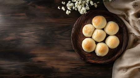 A serene scene featuring freshly baked bread rolls cooling on a rustic wooden table. Natural light enhances the warm tones, creating a cozy atmosphere perfect for showcasing homemade culinary delights.