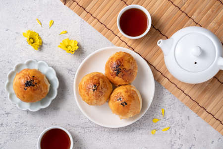 Design concept of Moon cake yolk pastry, mooncake for Mid-Autumn Festival holiday on gray table background