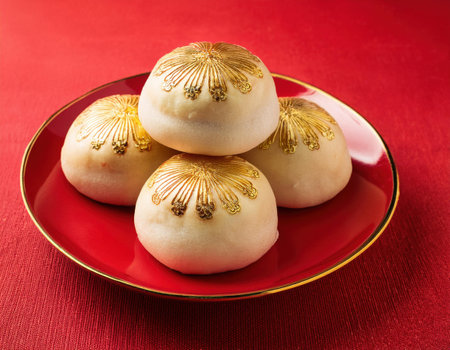 Experience the allure of traditional Japanese mochi, a soft rice cake filled with sweet red bean, presented beautifully on an ornate plate.