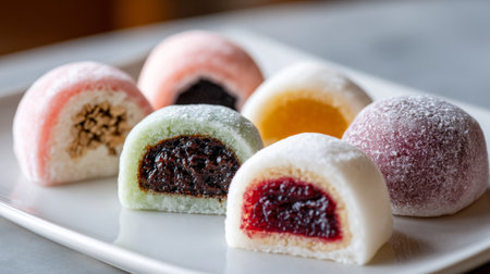 A vibrant selection of Japanese mochi desserts on a white plate showcasing different fillings. Each piece features a soft texture and colorful exterior, appealing to food lovers.