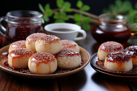 Japanese mochi white round shaped dessert with a red poured jam or topping with a blurred tea and kitchen background, healthy and aesthetic snack. High quality photo