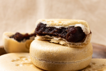side view cut out red bean paste cake on a brown background