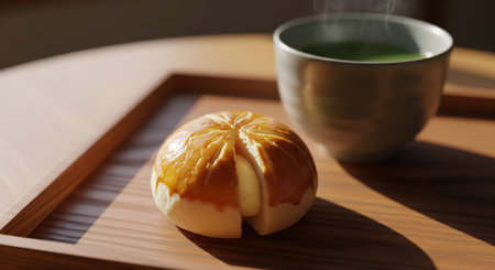 This image showcases a delightful dessert filled with sweet red bean paste, expertly dusted with powdered sugar, set beautifully on a wooden mat with tea in the background.