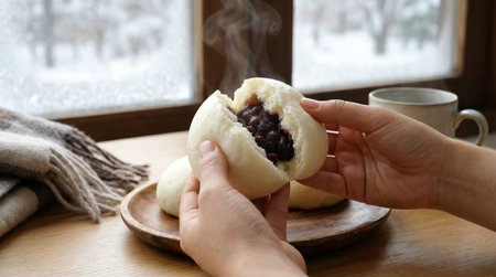 Asian woman hand holding steamed bun with black bean on wooden table.