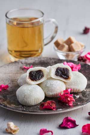 Soft mochi filled with red bean paste, set on a ceramic plate with a cup