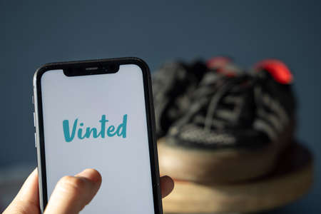Closeup of female hand holding iPhone X with logo lettering of online store vinta on screen