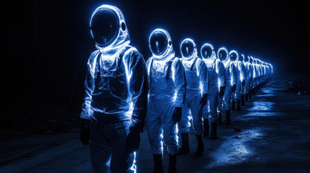 A group of astronauts in glowing suits walks in a dark setting creating a mesmerizing and futuristic atmosphere during their exploration.