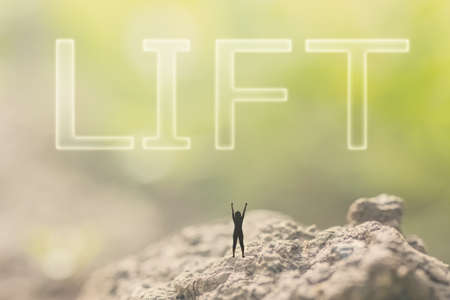 Concept of upgrade with a person stand in the outdoor and looking up the text over the sky in nature background.