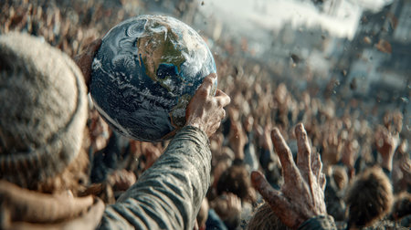 A passionate crowd holds a globe above their heads, symbolizing unity, climate action, and the fight for Earth future.