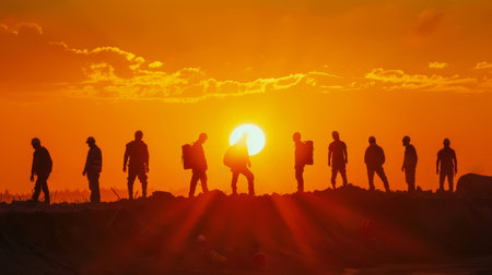 silhouettes of construction workers during sunset, dramatic sky. hardworking labor concept.