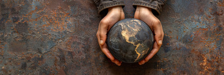 Hands holding Earth globe over rusty metal background, panoramic shot