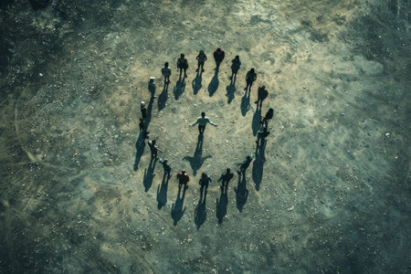 An aerial view of a diverse group of individuals forming a large circle with one person standing at the center, symbolizing unity and focus.