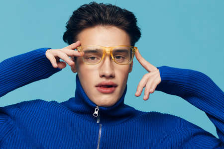 a cute man stands on a light blue background in a blue zip-up sweater and holds yellow sunglasses with his index fingers while looking at the camera.