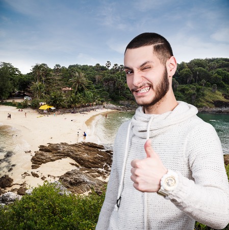 Happy lucky bearded hipster man on the beach