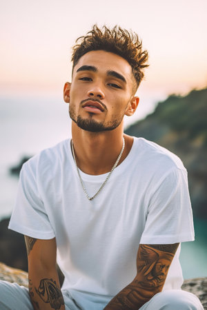 Young Maori man in white t shirt sits on rocks surrounded by scenic coastal views at dusk.
