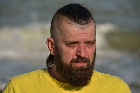 brutal pensive man with a beard against the background of an empty sky and sea