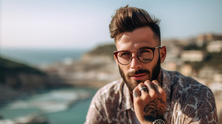 Perfect style Side view of young bearded man in eyewear looking away while standing outdoors : Generative AI