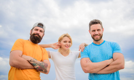 Woman and men look confident while stay close each other like team. Confident in teammates. Feel comfortable with friends teammates. Trust and support attributes of true team. Strength in unity