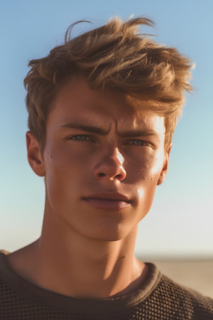 Portrait of a handsome young man with blond hair on the beach