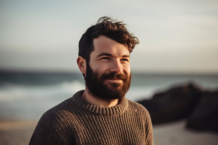 Portrait of a handsome bearded man standing on the beach at sunset