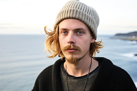 Portrait of a handsome young man in a knitted hat on the background of the sea