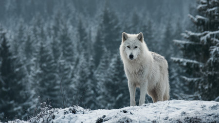 A striking white wolf is captured in a medium shot, standing on a snow-covered hill. The animal's fur is pristine white, contrasting against the blurred background of a snow-laden evergreen forest. The lighting is diffused, suggesting an overcast day. This image could be used for various commercial and editorial applications.