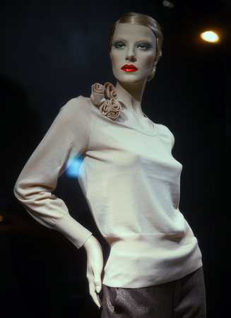 Shop dummy fashion mannequin in department store boutique window wearing current trends in garments.