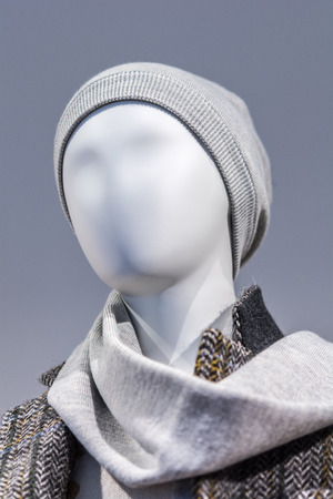 Mannequin in hat. headdress on head. Stylish clothing. fashion today. Mannequin Store.