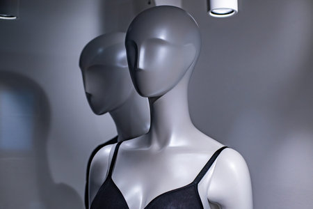 Gray mannequins displayed in modern fashion store. Minimalist scene with lingerie and soft directional light. Fashion composition showing abstract female forms. Mannequins in boutique interior.
