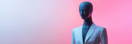 A stylish mannequin dressed in a modern outfit stands against a soft pastel background, illuminated by clean lighting with blank space for text.