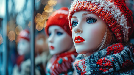 Discover an upscale boutique window display featuring stylish mannequins dressed in vibrant fashions. Perfect for capturing the charm of winter shopping experiences.