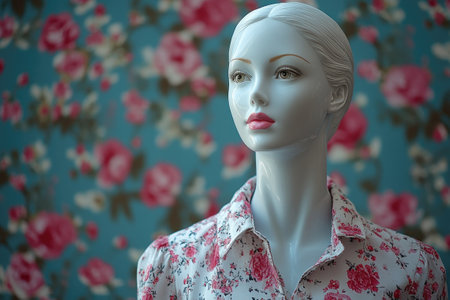 Plastic female mannequin showcasing a modern design in front of turquoise floral background