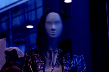 Mannequin in a shop window, shallow depth of field.