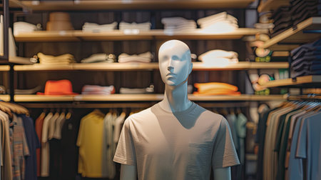 a dummy mannequin wearing a simple colored t-shirt in a clean and premium t-shirt shop setting