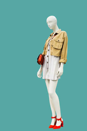 Full-length female mannequin dressed in fashionable clothes, isolated. No brand names or copyright objects.