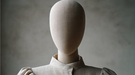 Sculptural female mannequin in minimalist faceless style with cloud dancer softness.