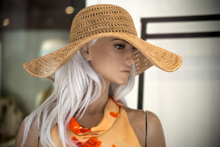 Mannequin in hat. headdress on head. Stylish clothing. fashion today. Mannequin Store.