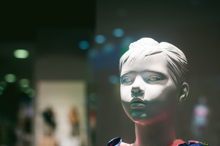 dummy on a shop window. Child face in the background of the store