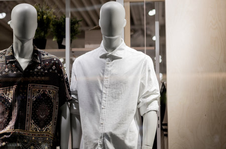 Two male mannequins dressed in shirt. No brand names or copyright objects.