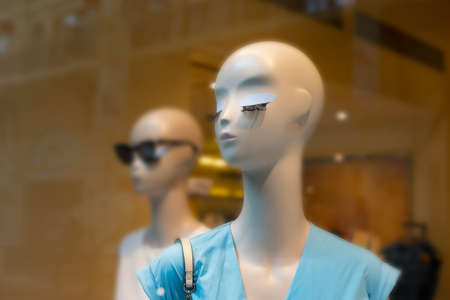 Mannequins show fashion clothes in shop. Sale of luxury clothing in shopping mall