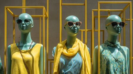 This captivating image features mannequins showcasing summer fashion with vibrant yellow clothing and stylish sunglasses, set against a bright backdrop.