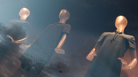 Mannequins wear vibrant, trendy outfits as they stand amidst a captivating surreal fog, creating a polished and dreamy atmosphere.